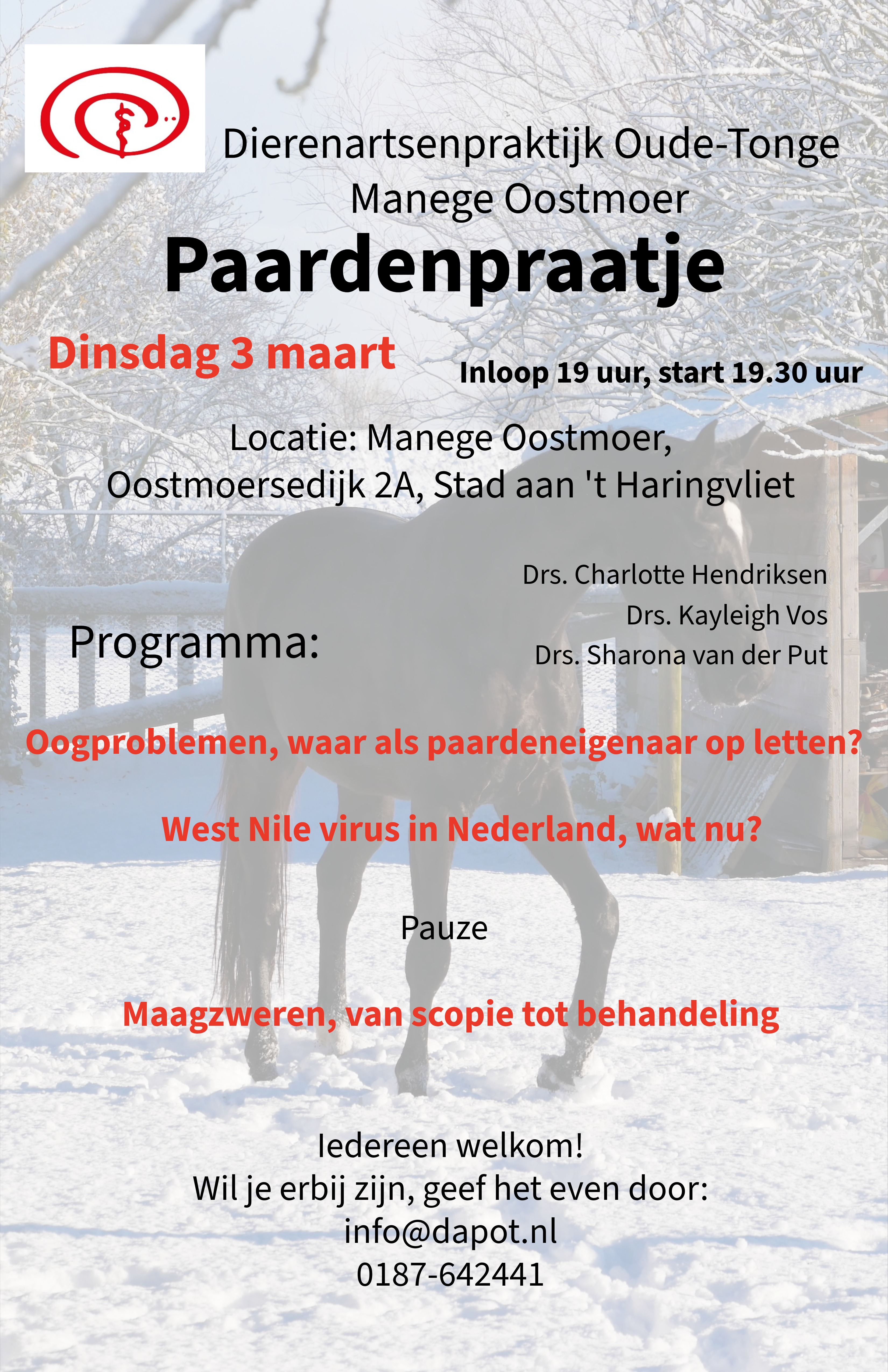 Op 3 maart 2026 organiseert team dierenartsen Paard in samenwerking met Manege Oostmoer een informatieve bijeenkomst voor de paardenliefhebber. Iedereen is welkom! Locatie: Manege Oostmoer in Stad...